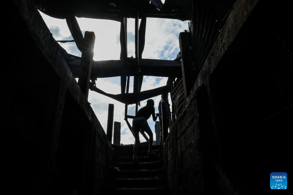 A man searches for belongings after a fire at a slum area in Manila, the Philippines, March 22, 2024. A fire broke out Thursday night, razing about 140 homes, according to the Philippine Bureau of Fire Protection. (Xinhua/Rouelle Umali)