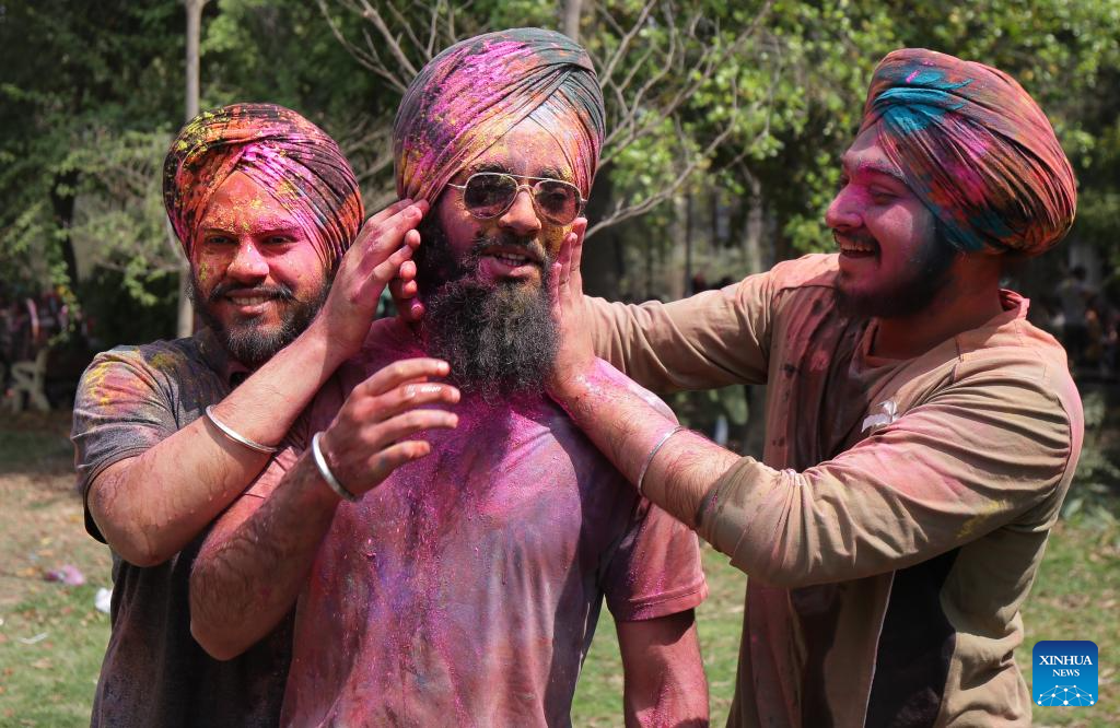 People smeared with colored powder take part in a celebration of the Holi festival in Amritsar district of India's northern Punjab state, March 22, 2024. Holi, the festival of colors, marks the beginning of the spring season. (Str/Xinhua)