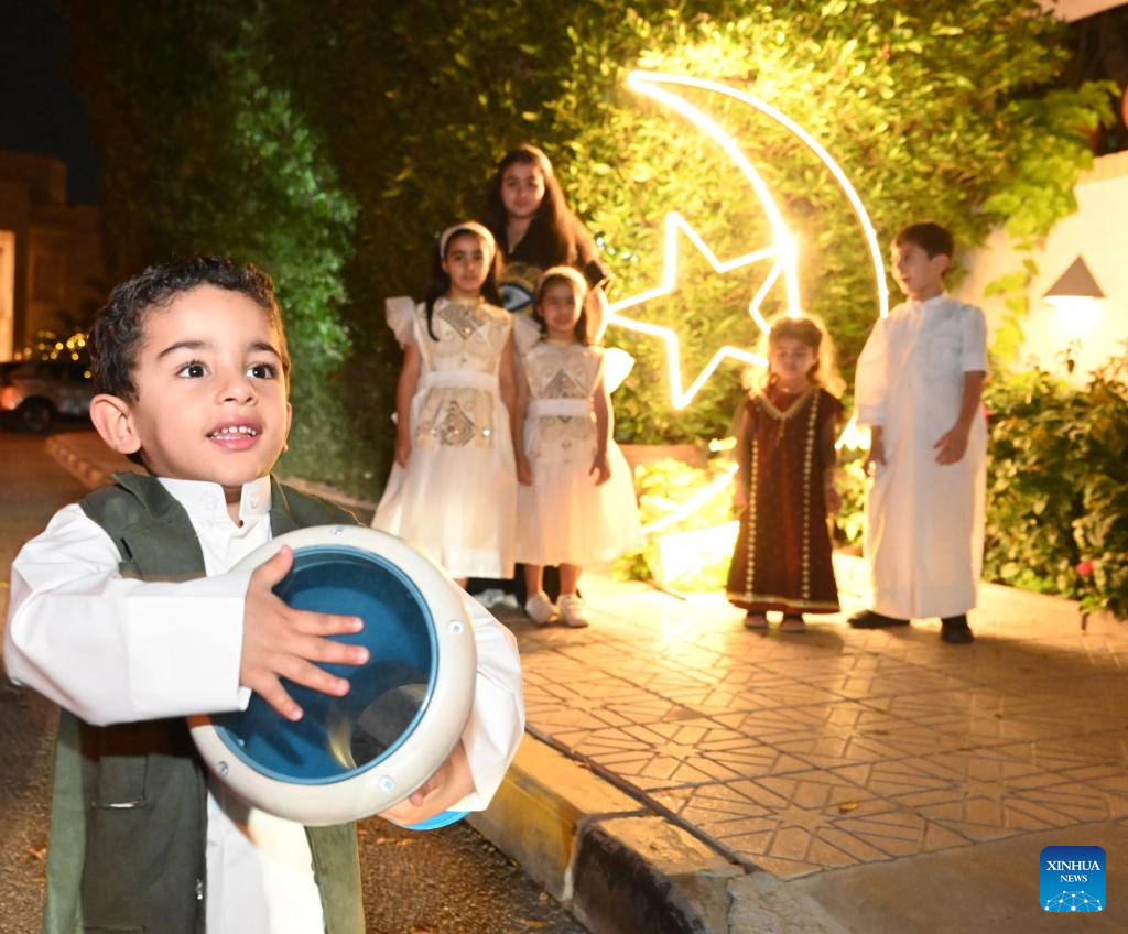 Children celebrate Gargee'an festival at a street in Hawalli Governorate, Kuwait, March 23, 2024. During the traditional festival of Gargee'an in the holy month Ramadan, Kuwaiti children dress in traditional attire and go door-to-door to receive sweets and nuts from neighbors, while also singing traditional songs. (Photo by Asad/Xinhua)