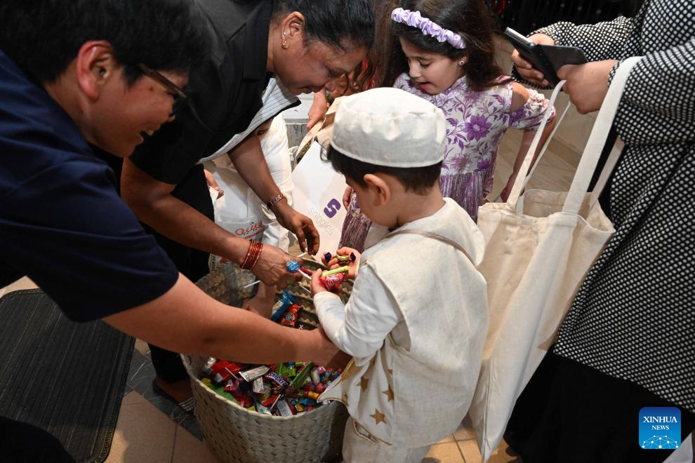 Children receive sweets during Gargee'an festival at a street in Hawalli Governorate, Kuwait, March 23, 2024. During the traditional festival of Gargee'an in the holy month Ramadan, Kuwaiti children dress in traditional attire and go door-to-door to receive sweets and nuts from neighbors, while also singing traditional songs. (Photo by Asad/Xinhua)