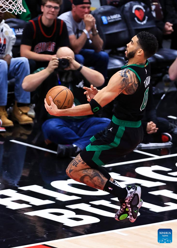Boston Celtics forward Jayson Tatum goes for a layup during NBA regular season game between Boston Celtics and Chicago Bulls in Chicago, the United States on March 23, 2024. (Photo by Joel Lerner/Xinhua)