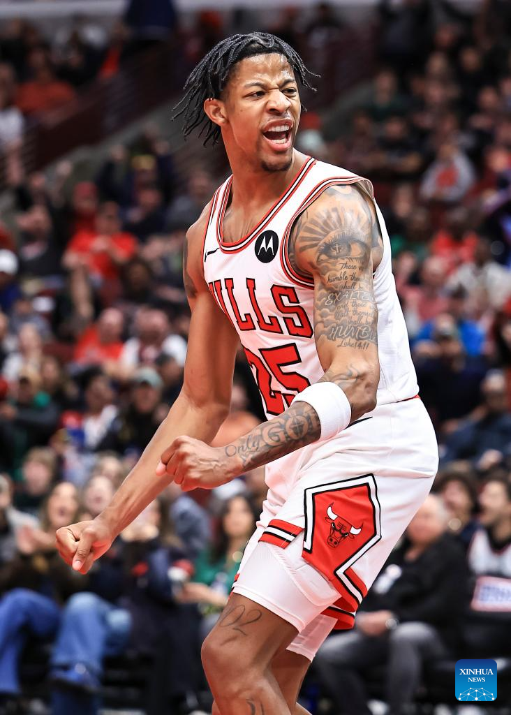 Chicago Bulls forward Dalen Terry celebrates after scoring during NBA regular season game between Boston Celtics and Chicago Bulls in Chicago, the United States on March 23, 2024. (Photo by Joel Lerner/Xinhua)