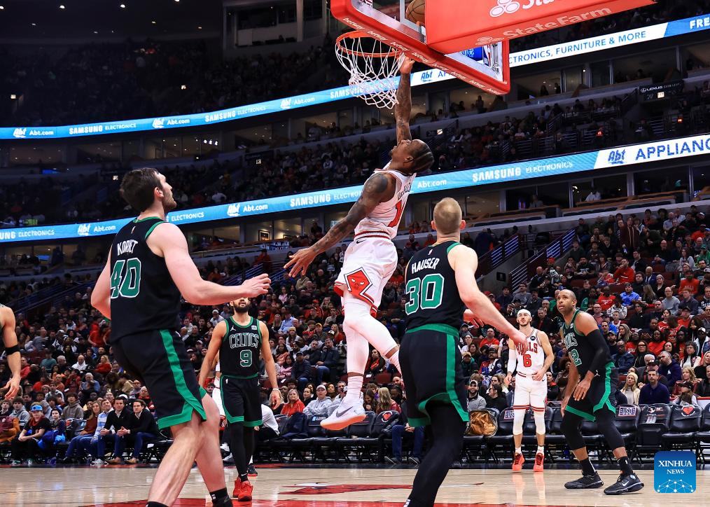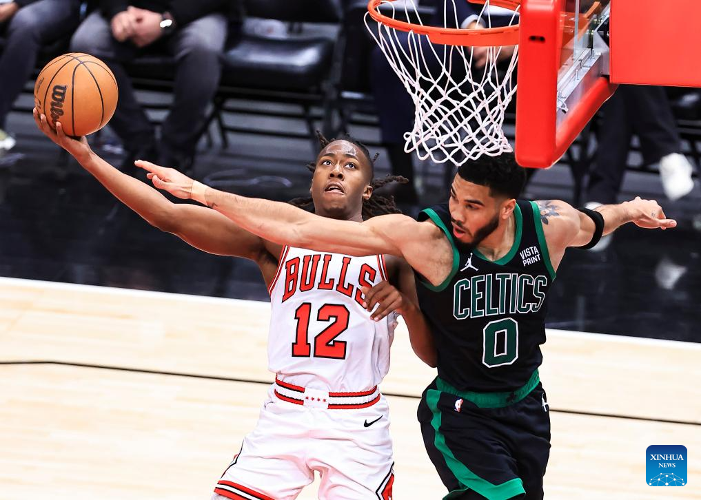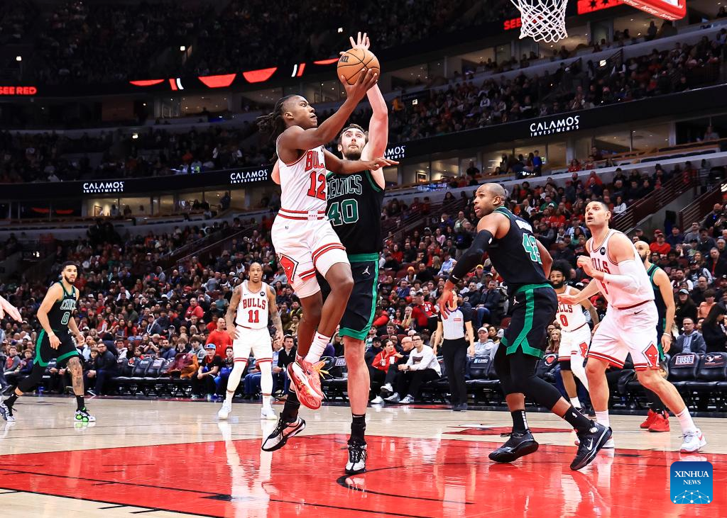 Chicago Bulls guard Ayo Dosunmu (L, top) goes for a layup during NBA regular season game between Boston Celtics and Chicago Bulls in Chicago, the United States on March 23, 2024. (Photo by Joel Lerner/Xinhua)