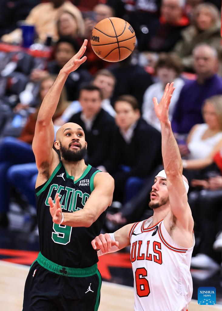 Boston Celtics guard Derrick White (L) throws a pass during NBA regular season game between Boston Celtics and Chicago Bulls in Chicago, the United States on March 23, 2024. (Photo by Joel Lerner/Xinhua)