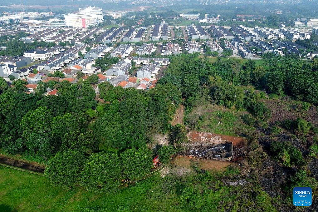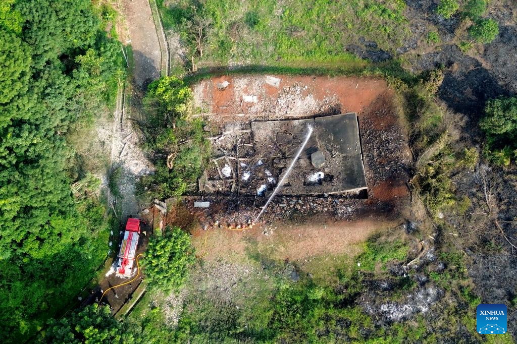 An aerial drone photo taken on March 31, 2024 shows firefighters working at the site of an explosion in Bogor, West Java, Indonesia. The explosion rocked a military complex near Indonesia's capital city Jakarta on Saturday evening. (Photo by Gemma Galgani/Xinhua)