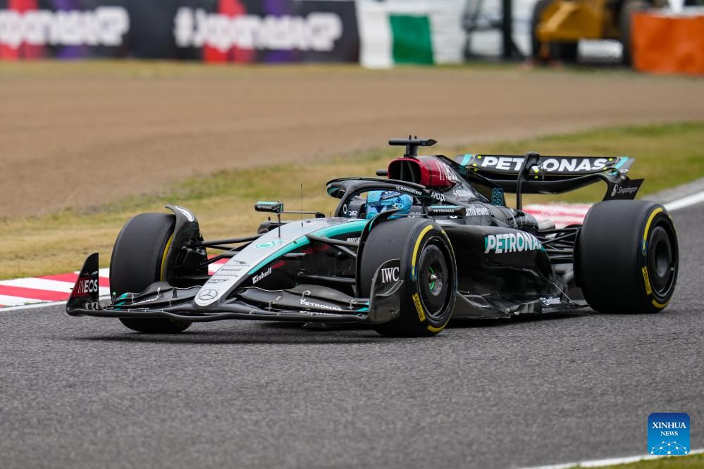 Mercedes's driver George Russell of Britain drives his car during the practice session of Formula One Japanese Grand Prix in Suzuka, Japan, April 5, 2024. (Xinhua/Zhang Xiaoyu)