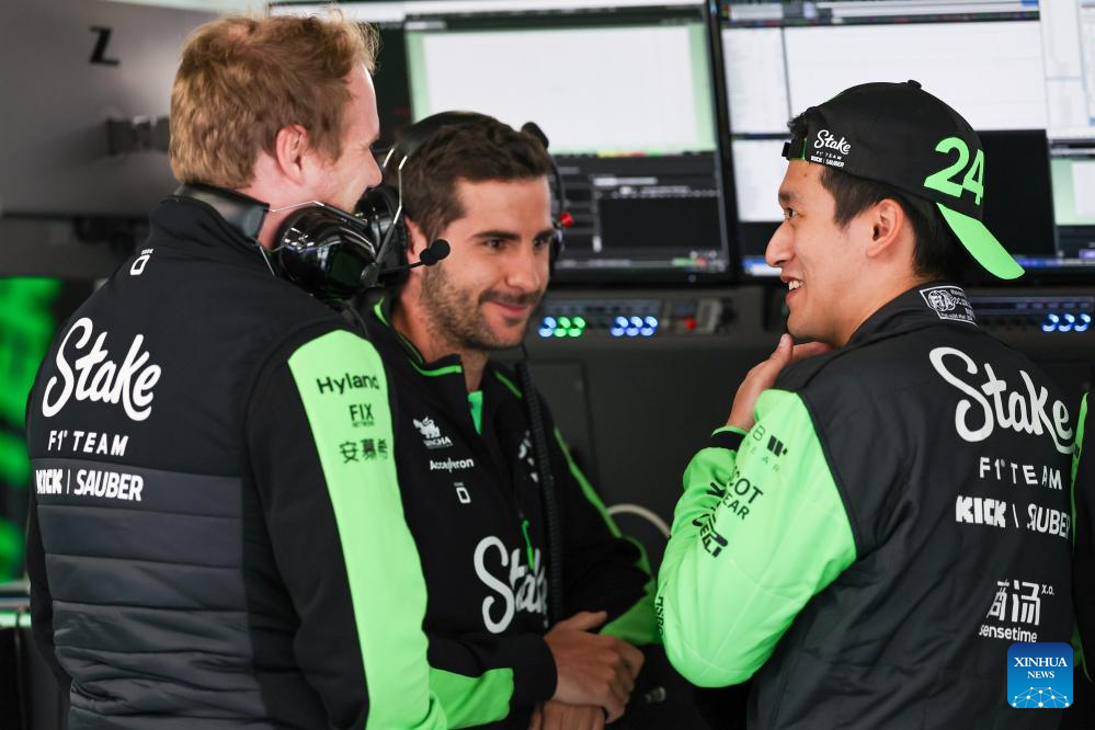Kick Sauber's Zhou Guanyu (R) of China talks with crew members before the practice session of Formula One Japanese Grand Prix in Suzuka, Japan, April 5, 2024. (Photo by Qian Jun/Xinhua)