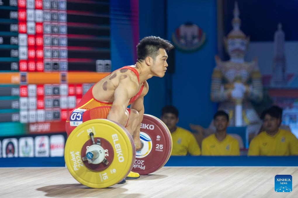 Shi Zhiyong of China competes in the men's 73kg competition at the International Weightlifting Federation (IWF) World Cup in Phuket, Thailand, April 4, 2024. (Xinhua/Lin Hao)