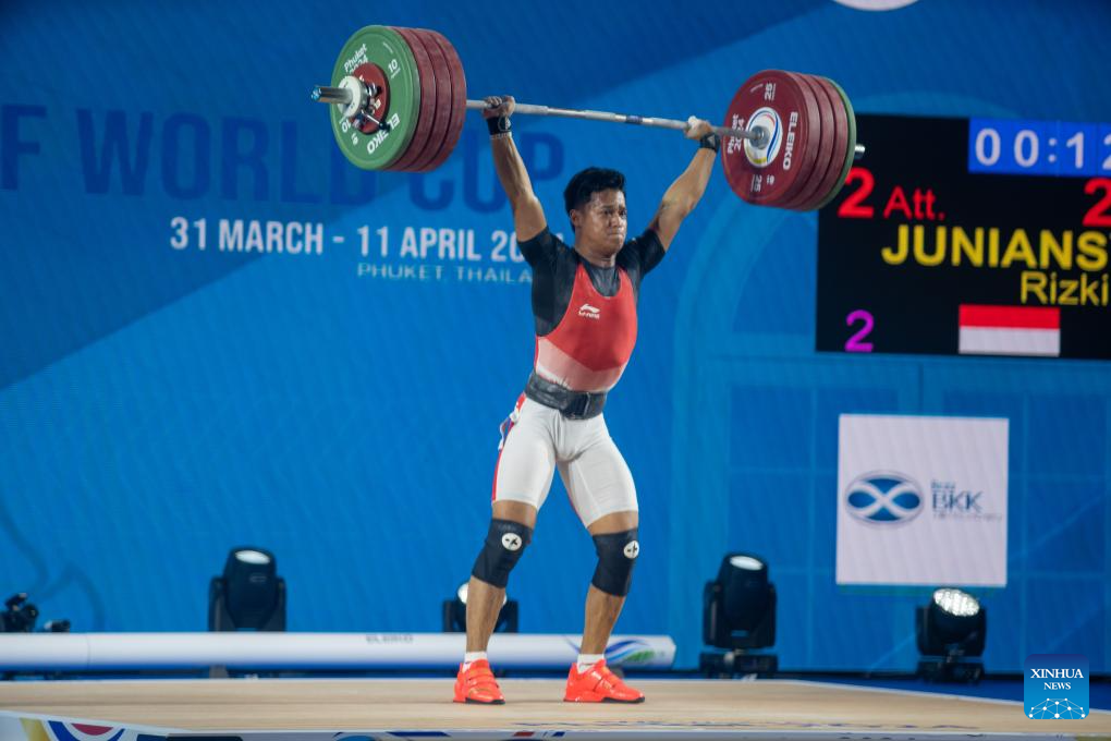 Rizki Juniansyah of Indonesia competes in the men's 73kg competition at the International Weightlifting Federation (IWF) World Cup in Phuket, Thailand, April 4, 2024. (Xinhua/Lin Hao)