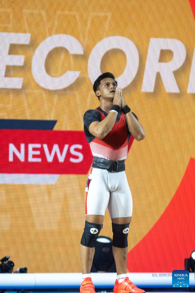 Rizki Juniansyah of Indonesia celebrates during the men's 73kg competition at the International Weightlifting Federation (IWF) World Cup in Phuket, Thailand, April 4, 2024. (Xinhua/Lin Hao)