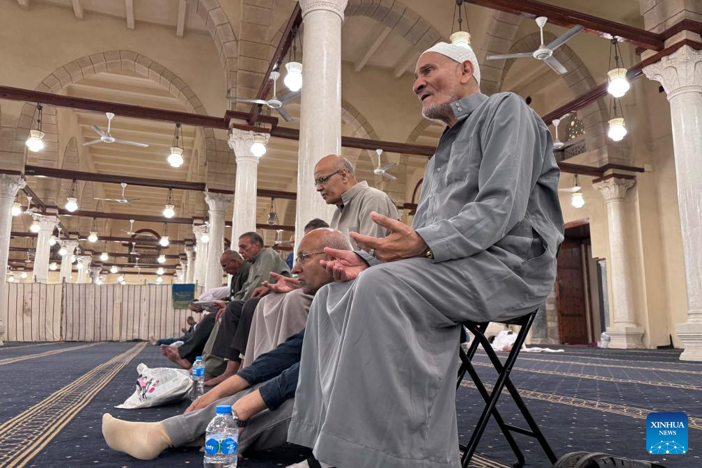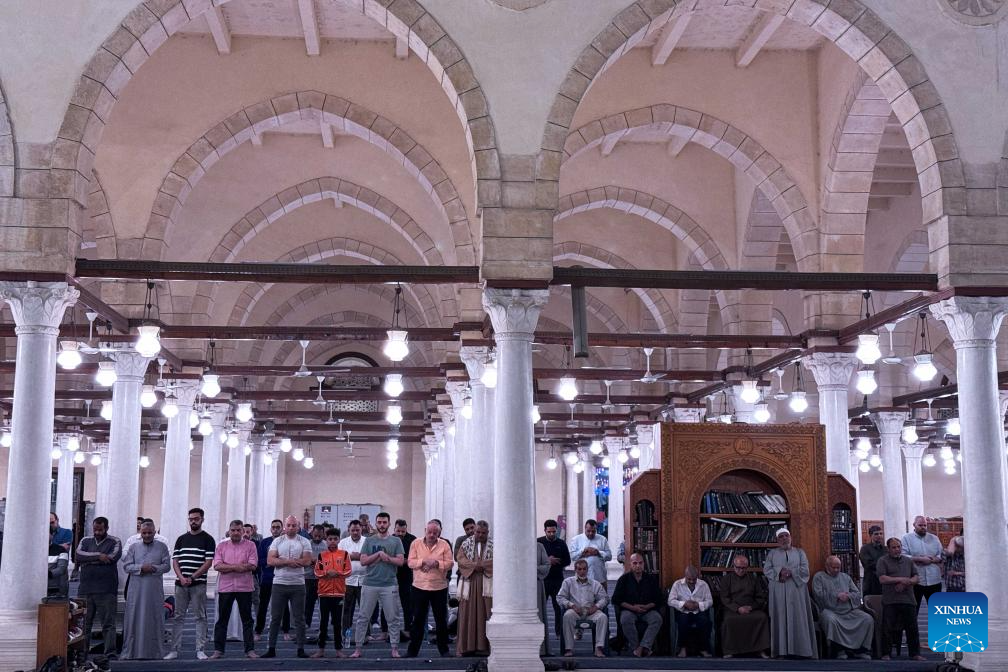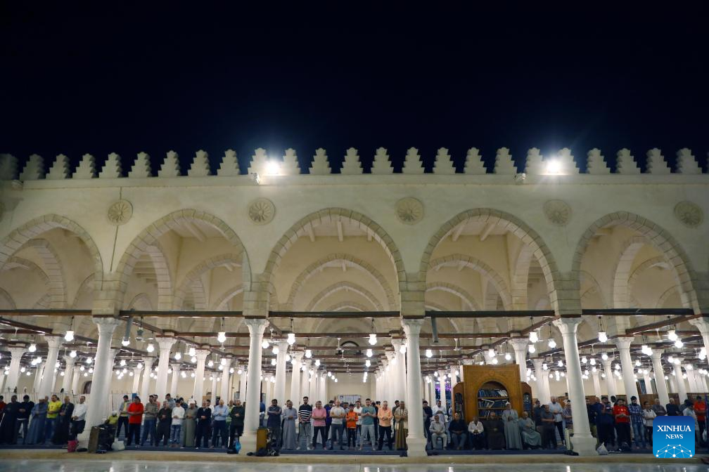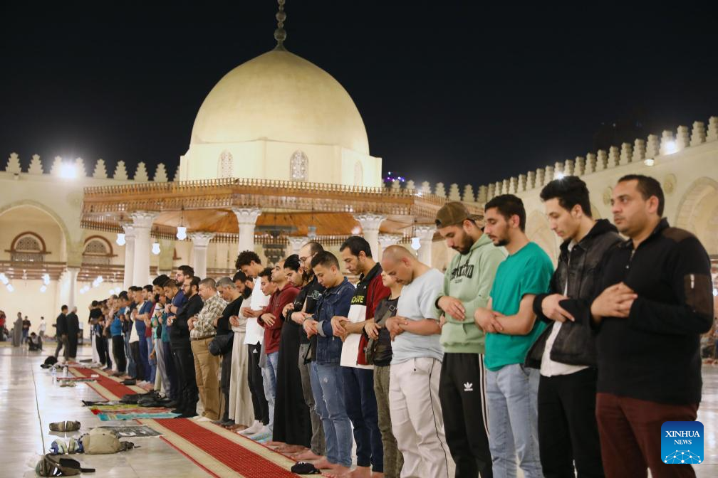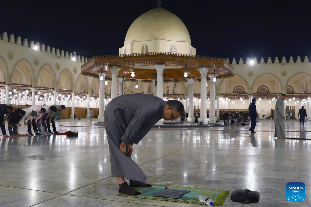 Muslims attend Laylat al-Qadr night prayers during Ramadan at Amr ibn Al-A'as Mosque in Cairo, Egypt, on April 5, 2024. (Xinhua/Ahmed Gomaa)