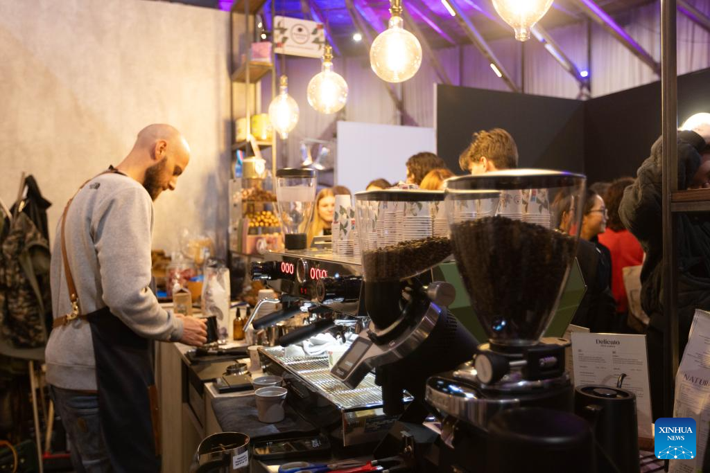 A barista makes coffee at the Amsterdam Coffee Festival in Amsterdam, the Netherlands, on April 5, 2024. (Photo by Sylvia Lederer/Xinhua)