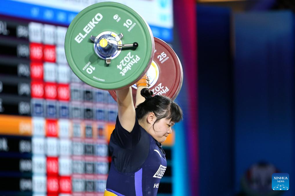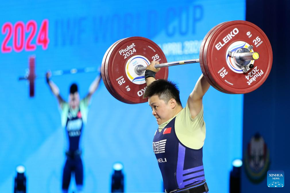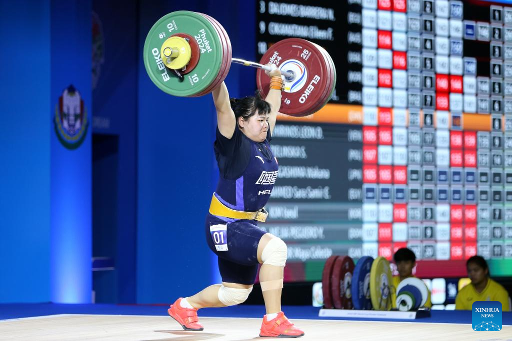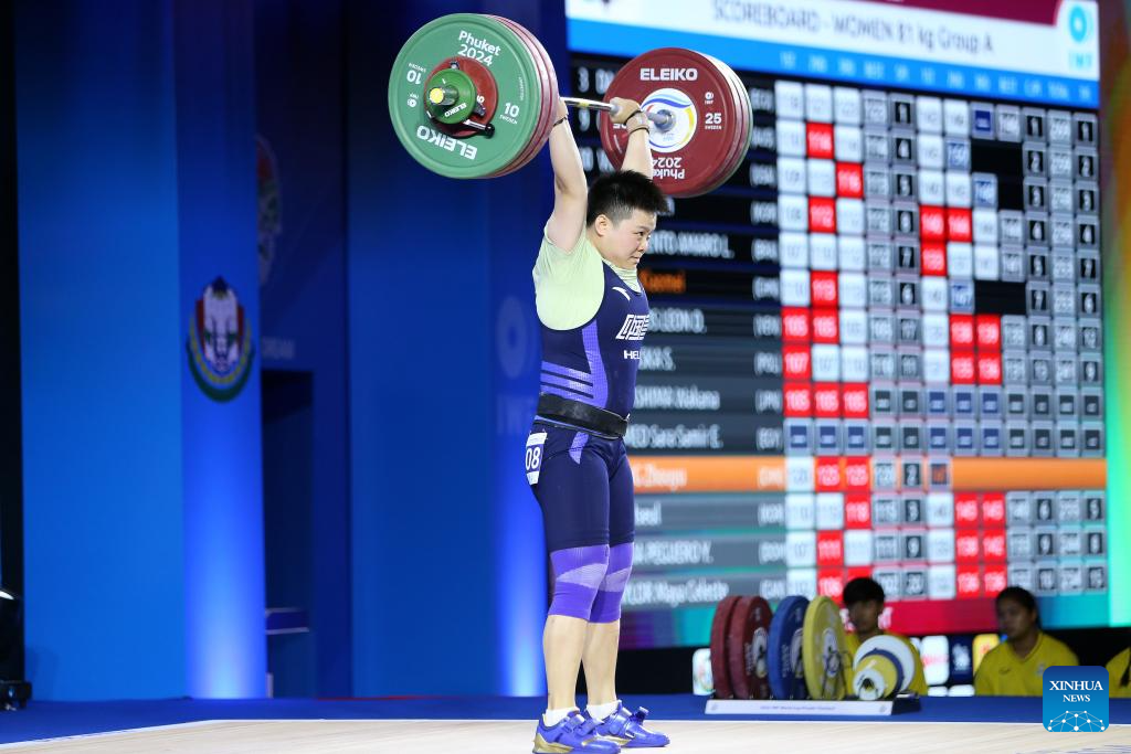 Wang Zhouyu of China competes in the women's 81kg category at the International Weightlifting Federation (IWF) World Cup in Phuket, Thailand, April 9, 2024. (Xinhua/Wang Teng)