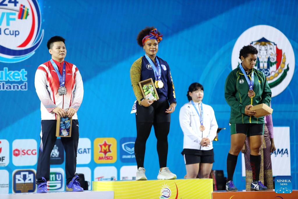 Neisi Patricia Dajomes Barrera (C) of Ecuador, Wang Zhouyu (L) of China and Eileen Cikamatana of Australia pose during the awarding ceremony for the women's 81kg category at the International Weightlifting Federation (IWF) World Cup in Phuket, Thailand, April 9, 2024. (Xinhua/Wang Teng)