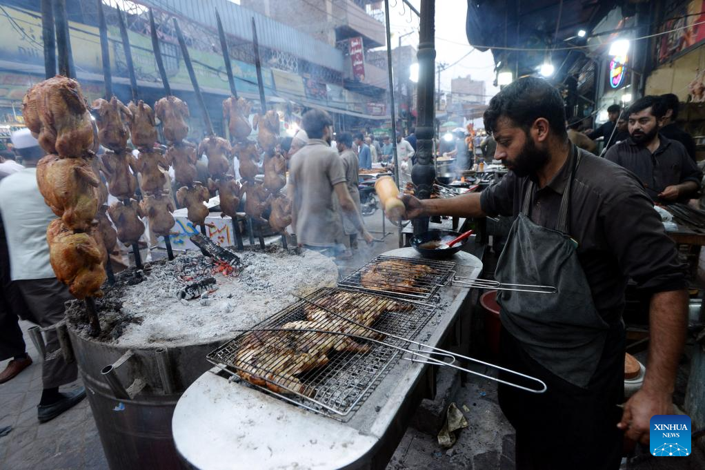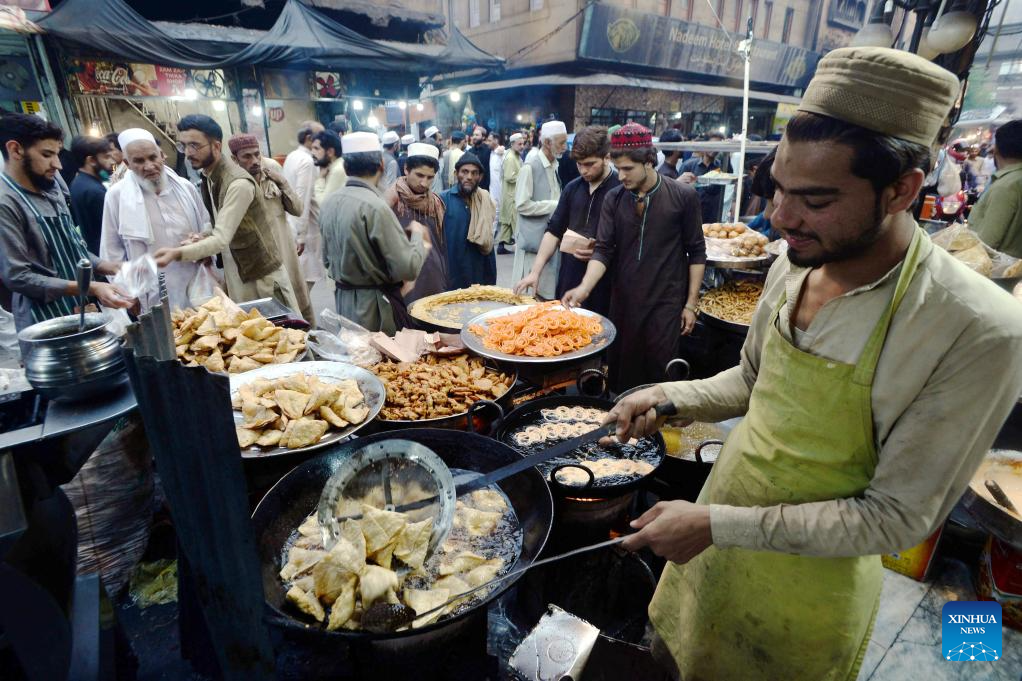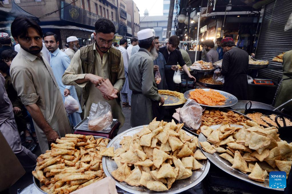 People buy snacks for Iftar, a meal to break fast during holy month of Ramadan, in northwest Pakistan's Peshawar on April 8, 2024. (Photo by Umar Qayyum/Xinhua)