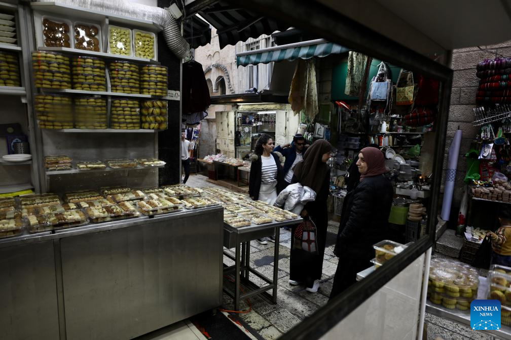 People shop ahead of the upcoming Eid al-Fitr in Jerusalem's Old City, on April 9, 2024. (Photo by Jamal Awad/Xinhua)