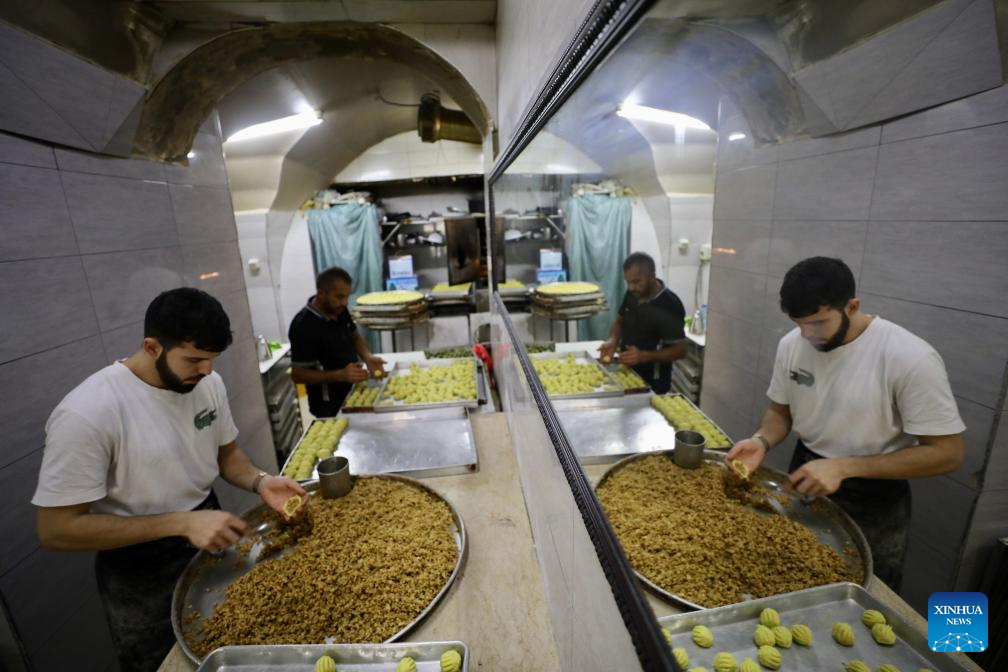 Workers make traditional sweets in preparation for the upcoming Eid al-Fitr in Jerusalem's Old City, on April 9, 2024. (Photo by Jamal Awad/Xinhua)