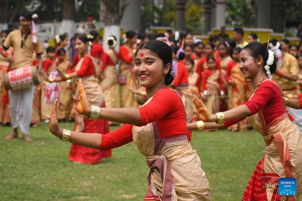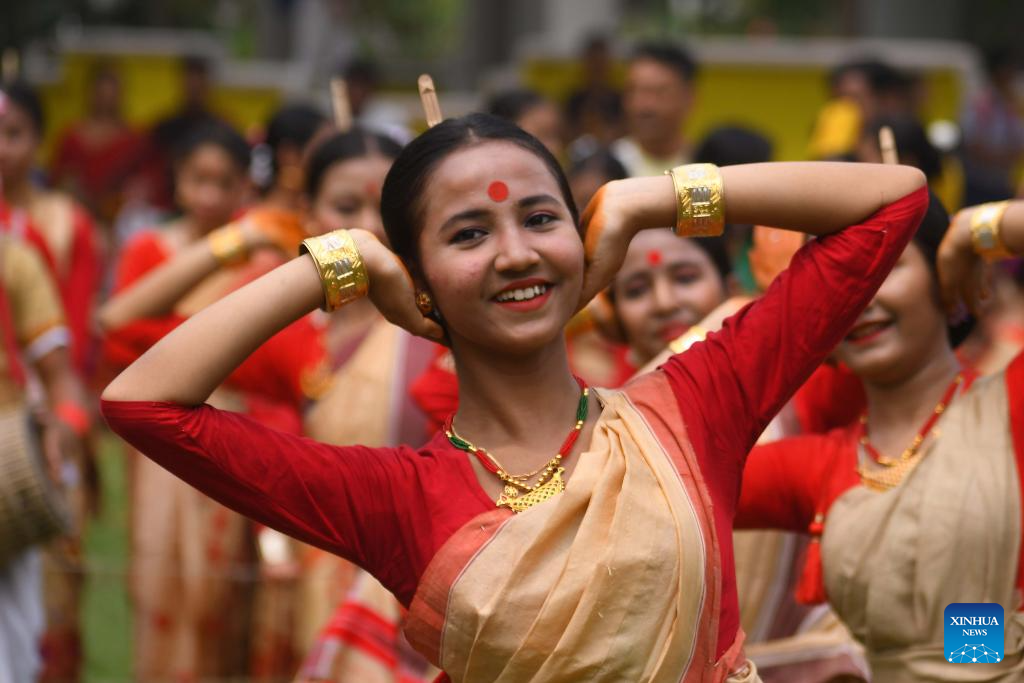People perform folk dance during the celebration for the upcoming Rangoli Bihu Festival in Guwahati city of India's northeastern state of Assam, April 10, 2024. (Str/Xinhua)