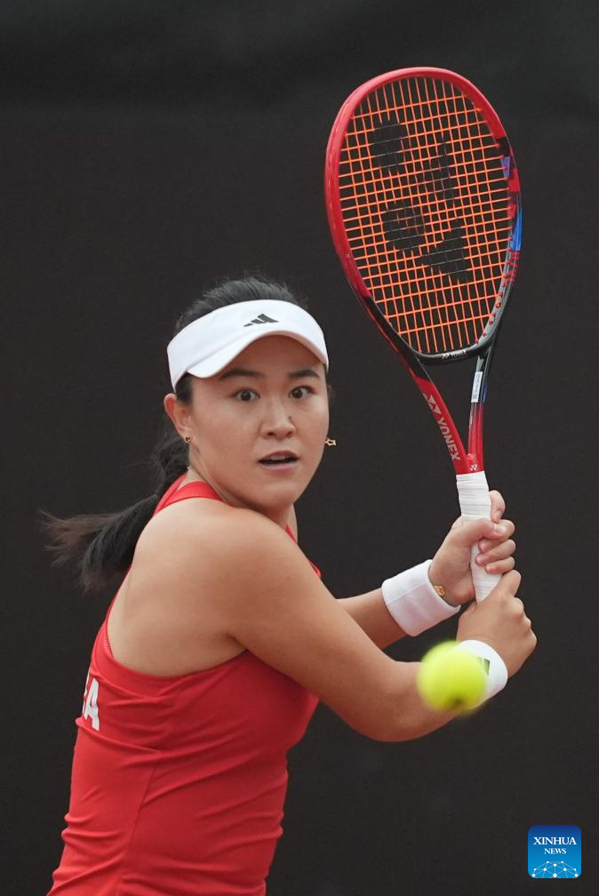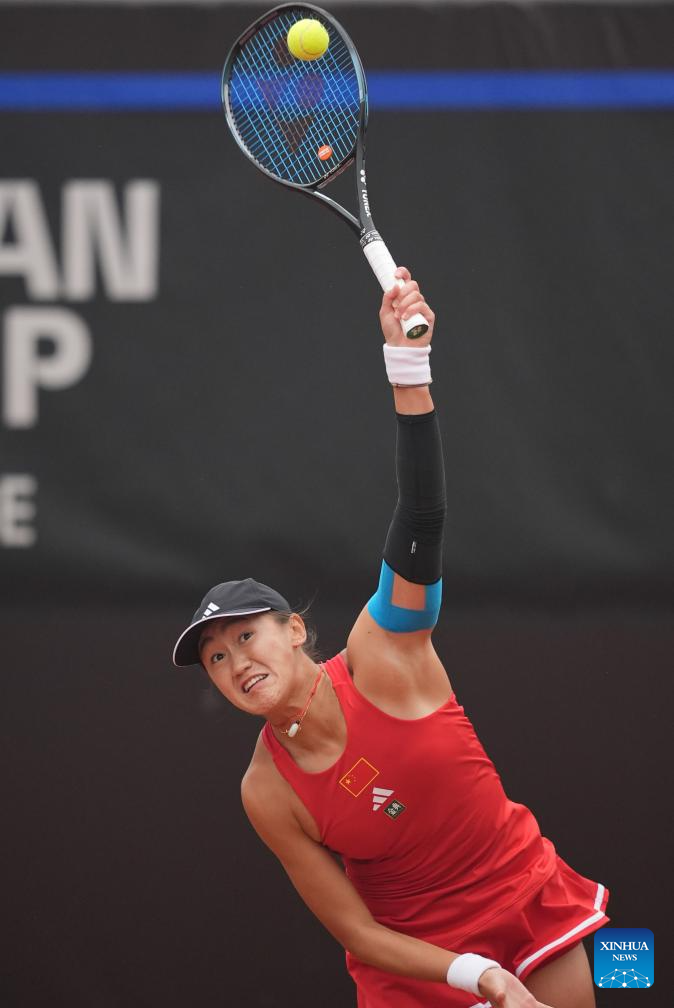 Zhu Lin of China returns the ball during the women's singles match against Valentina Ivanov of New Zealand at the Billie Jean King Cup 2024 tennis tournament Asia-Oceania Group I match in Changsha, central China's Hunan Province, April 11, 2024. (Xinhua/Xue Yuge)