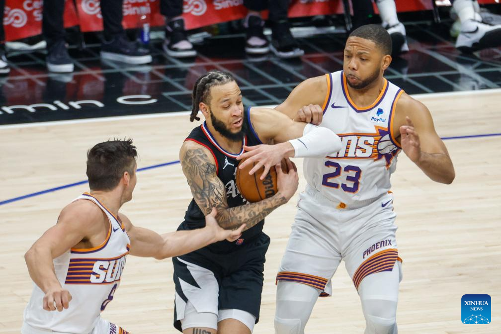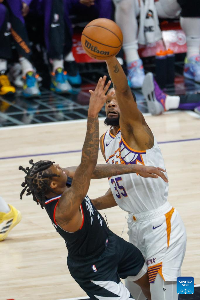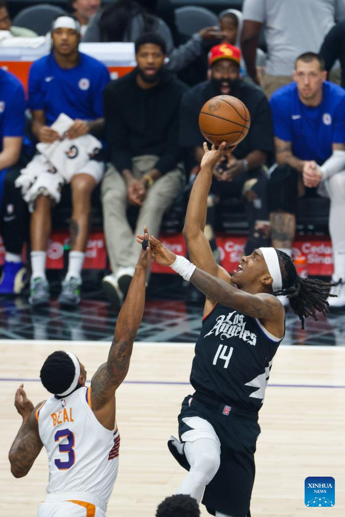 Los Angeles Clippers' Terance Mann (R) shoots against Phoenix Suns' Bradley Deal during the 2023-2024 NBA regular season match between Los Angeles Clippers and Phoenix Suns in Los Angeles, the United States, April 10, 2024. (Photo by Ringo Chiu/Xinhua)