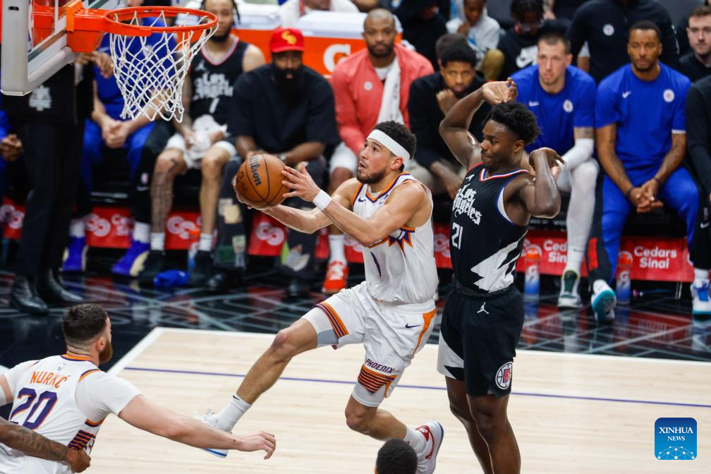 Phoenix Suns' Devin Booker (C) goes to the basket during the 2023-2024 NBA regular season match between Los Angeles Clippers and Phoenix Suns in Los Angeles, the United States, April 10, 2024. (Photo by Ringo Chiu/Xinhua)