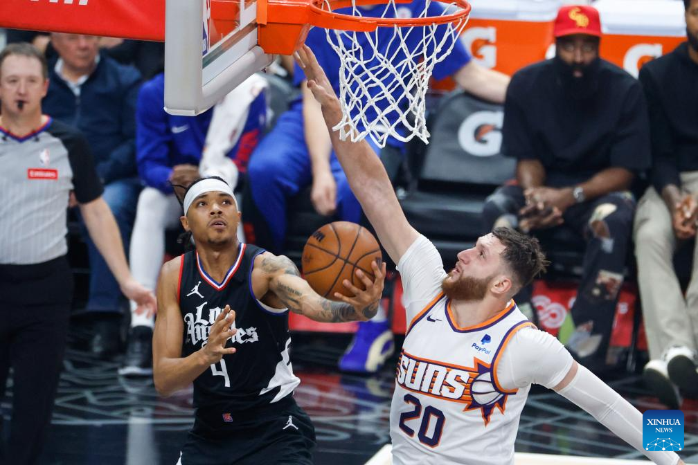 Los Angeles Clippers' Brandon Boston Jr. (L) goes to the basket under defence from Phoenix Suns' Jusuf Nurkic during the 2023-2024 NBA regular season match between Los Angeles Clippers and Phoenix Suns in Los Angeles, the United States, April 10, 2024. (Photo by Ringo Chiu/Xinhua)