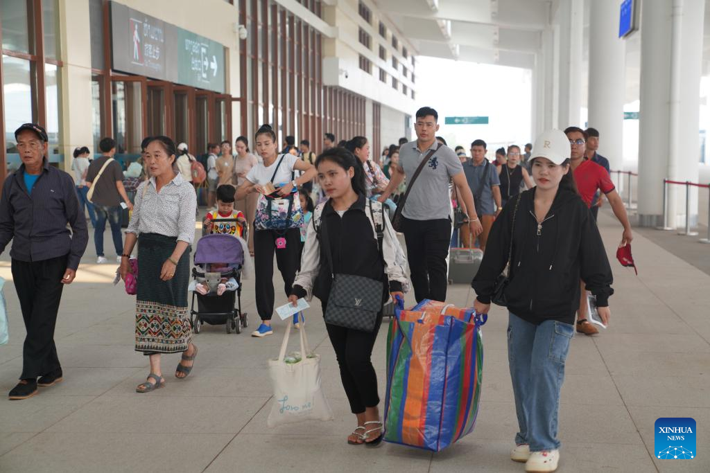 Passengers are pictured at the Vientiane Station of the China-Laos Railway in Vientiane, Laos, April 13, 2024. The Lao New Year is the most important festival in the Lao calendar. This year's holiday for celebrations runs from April 13 to 18. Public transportation is expected to see a travel peak during the period before and after the Lao New Year. (Photo by Kaikeo Saiyasane/Xinhua)