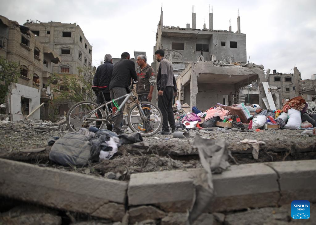 People check the debris after Israeli airstrikes at Al-Maghazi refugee camp in central Gaza Strip, April 13, 2024. (Xinhua)