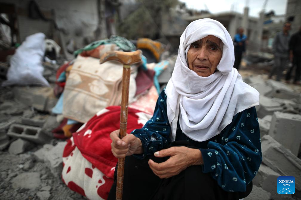An elderly woman sits on the debris after Israeli airstrikes at Al-Maghazi refugee camp in central Gaza Strip, April 13, 2024. (Xinhua)
