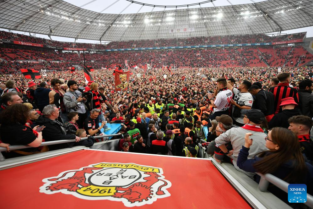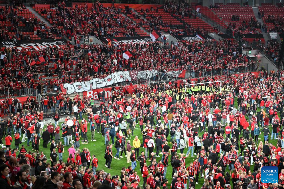 Fans of Bayer 04 Leverkusen celebrate after the first division of Bundesliga match between Bayer 04 Leverkusen and SV Werder Bremen in Leverkusen, Germany, April 14, 2024. (Photo by Ulrich Hufnagel/Xinhua)