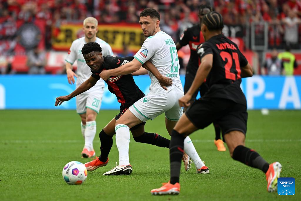 Nathan Tella (L, front) of Bayer 04 Leverkusen vies with Milos Veljkovic of SV Werder Bremen during the first division of Bundesliga match between Bayer 04 Leverkusen and SV Werder Bremen in Leverkusen, Germany, April 14, 2024. (Photo by Ulrich Hufnagel/Xinhua)
