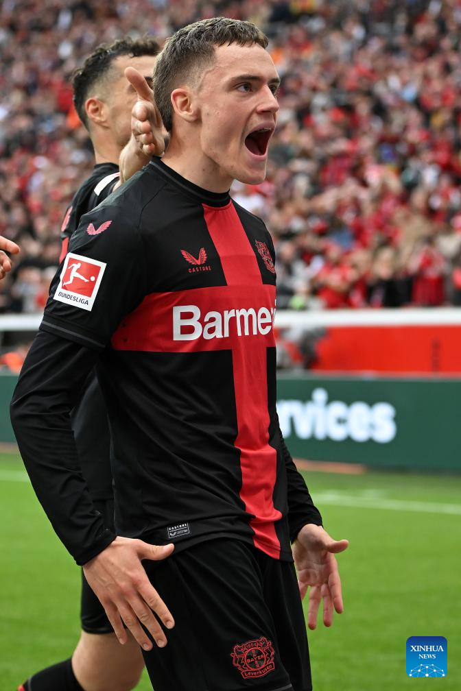 Florian Wirtz of Bayer 04 Leverkusen celebrates scoring during the first division of Bundesliga match between Bayer 04 Leverkusen and SV Werder Bremen in Leverkusen, Germany, April 14, 2024. (Photo by Ulrich Hufnagel/Xinhua)