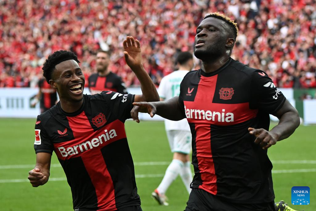Victor Boniface (R) of Bayer 04 Leverkusen celebrates scoring during the first division of Bundesliga match between Bayer 04 Leverkusen and SV Werder Bremen in Leverkusen, Germany, April 14, 2024. (Photo by Ulrich Hufnagel/Xinhua)