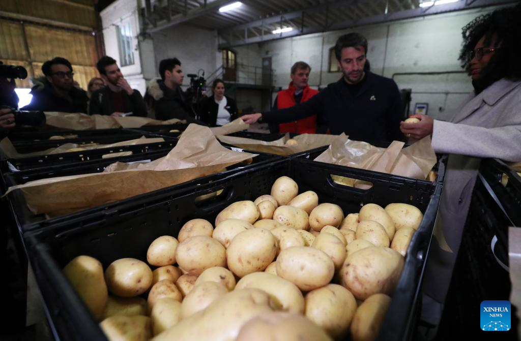 Potatoes are seen during a visit to the Vaulerand potato farm in Villeron, near Paris, France, April 18, 2024. French supermarket giant and Paris 2024 sponsor Carrefour presented its strategy to provide fresh produce for athletes at the Olympic Village during the Paris 2024 Olympic and Paralympic Games on Thursday. (Xinhua/Gao Jing)