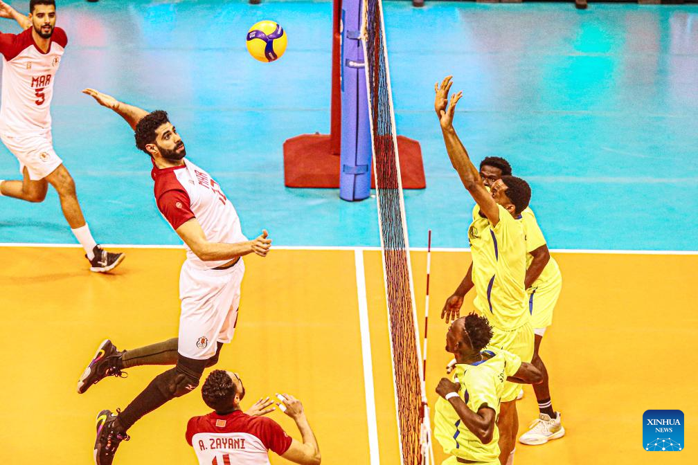 Mohamed Mamdouh (2nd L) of Faith Union Sport spikes during the match between Faith Union Sport of Morocco and Volleyball Club Green Team of Congo at the 2024 Men's African Volleyball Club Championship in Cairo, Egypt, on April 18, 2024. (Xinhua/Ahmed Gomaa)