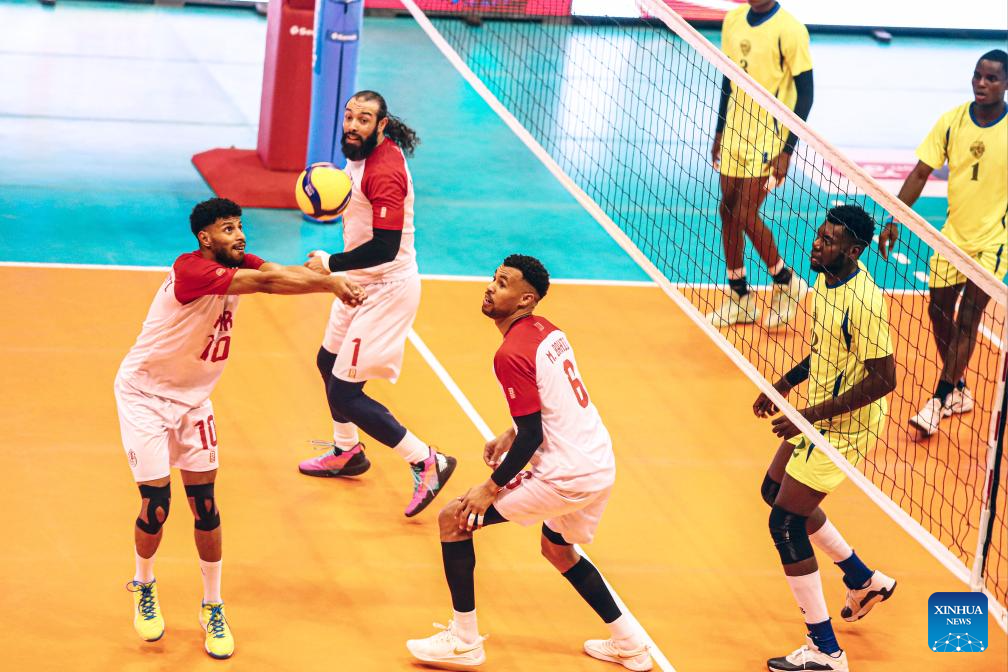 Soufiane El Gharouti (1st L) of Faith Union Sport passes the ball during the match between Faith Union Sport of Morocco and Volleyball Club Green Team of Congo at the 2024 Men's African Volleyball Club Championship in Cairo, Egypt, on April 18, 2024. (Xinhua/Ahmed Gomaa)