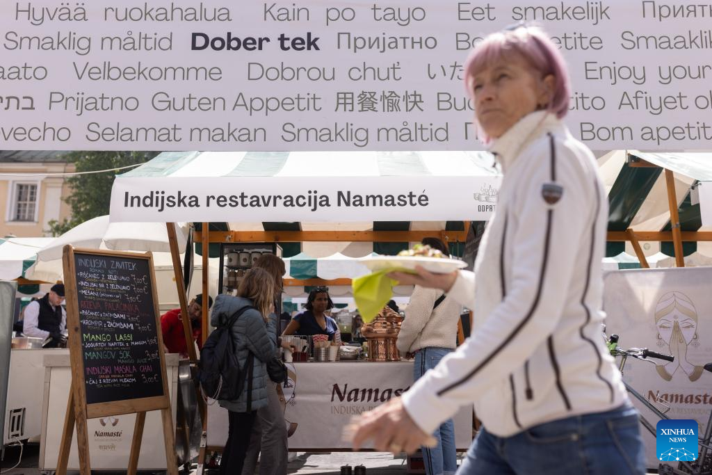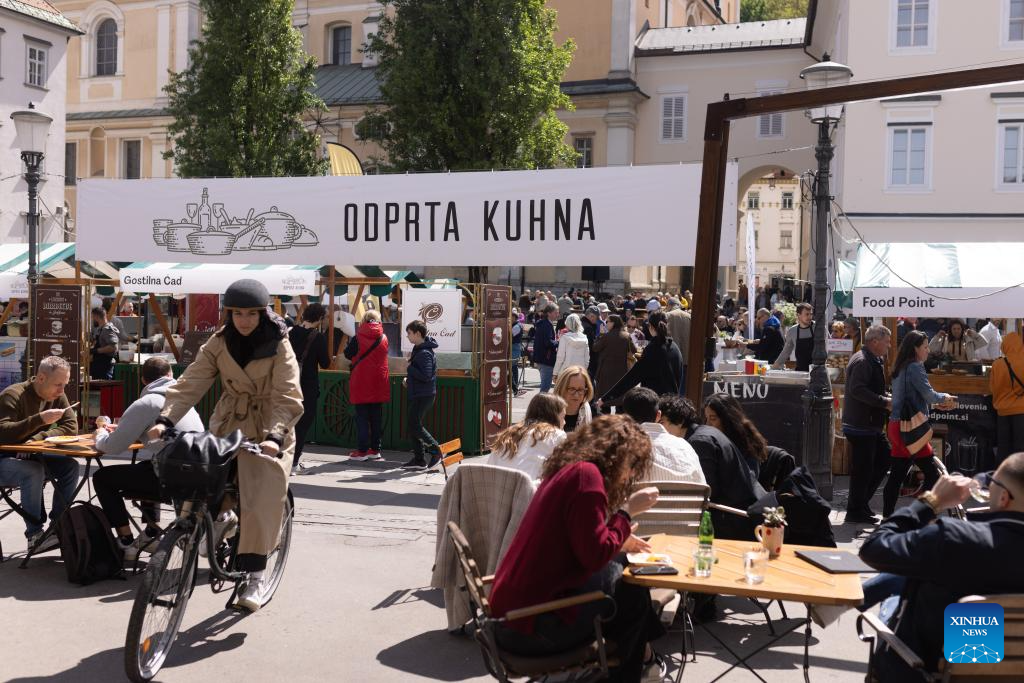 People enjoy food during the annual Open Kitchen event in Ljubljana, Slovenia, April 19, 2024. The Open Kitchen is a food market where people can experience the delights of freshly cooked food on the market stalls. (Photo by Zeljko Stevanic/Xinhua)