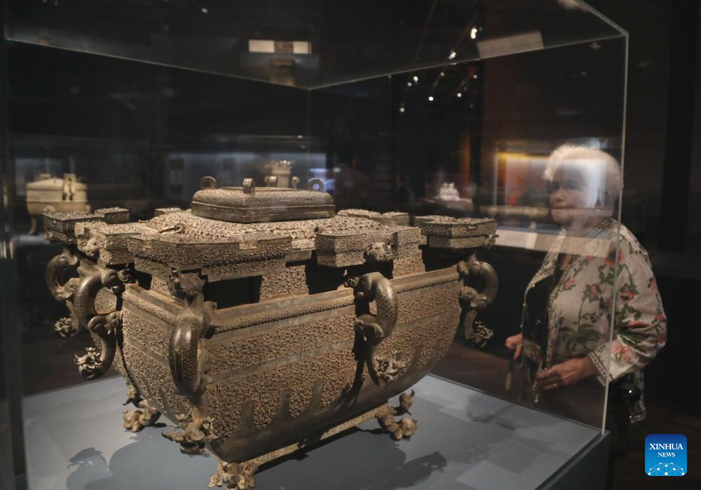 A visitor views an exhibit at a major exhibition of Chinese cultural relics from China's Bronze Age in San Francisco, California, the United States, April 19, 2024. The exhibition, held in the Asian Art Museum in San Francisco, opened on Friday. Titled "Phoenix Kingdoms: The Last Splendor of China's Bronze Age," it showcases more than 260 works from ancient Chinese Chu and Zeng kingdoms in the multistate Zhou Dynasty.