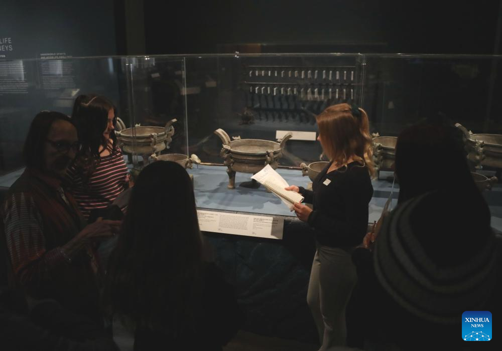 Visitors view exhibits at a major exhibition of Chinese cultural relics from China's Bronze Age in San Francisco, California, the United States, April 19, 2024. The exhibition, held in the Asian Art Museum in San Francisco, opened on Friday. Titled "Phoenix Kingdoms: The Last Splendor of China's Bronze Age," it showcases more than 260 works from ancient Chinese Chu and Zeng kingdoms in the multistate Zhou Dynasty.