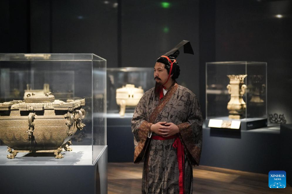 A visitor views exhibits at a major exhibition of Chinese cultural relics from China's Bronze Age in San Francisco, California, the United States, April 19, 2024. The exhibition, held in the Asian Art Museum in San Francisco, opened on Friday. Titled "Phoenix Kingdoms: The Last Splendor of China's Bronze Age," it showcases more than 260 works from ancient Chinese Chu and Zeng kingdoms in the multistate Zhou Dynasty.