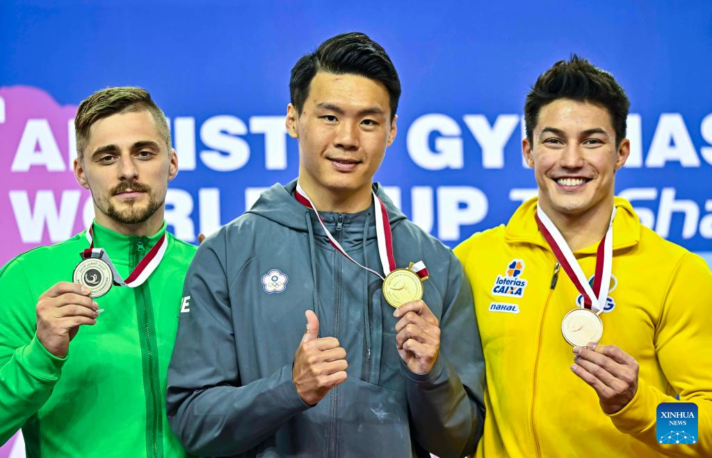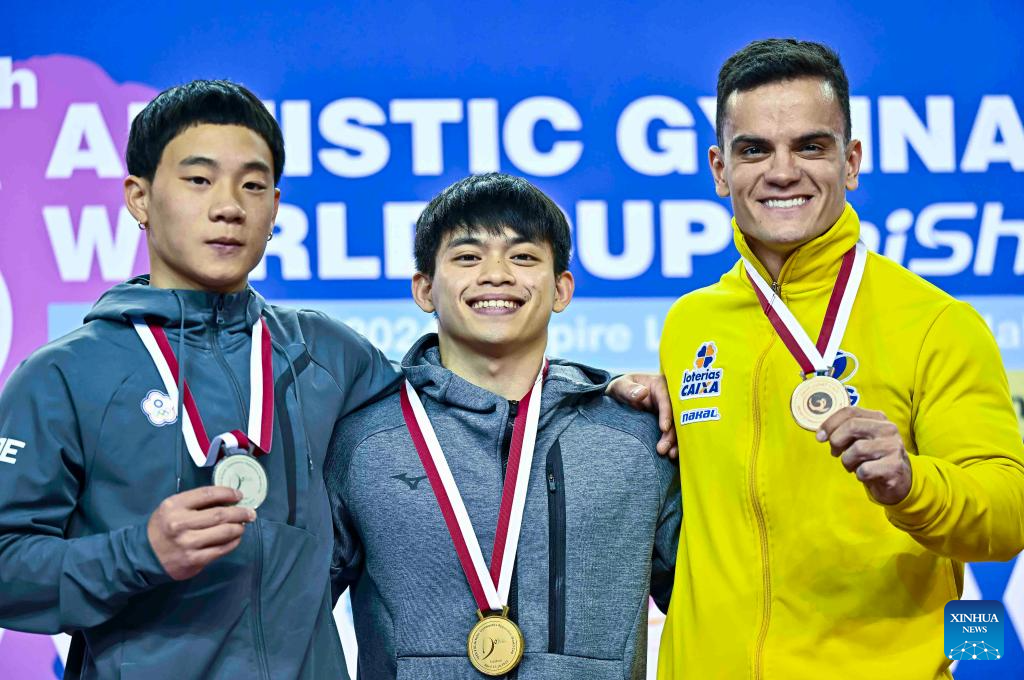Gold medalist Tang Chia-Hung (C) of Chinese Taipei, silver medalist Robert Tvorogal (L) of Lithuania and bronze medalist Arthur Mariano of Brazil pose for group photos during the awarding ceremony for the men's horizontal bar final event at the 16th FIG Artistic Gymnastics Apparatus World Cup in Doha, Qatar, April 20, 2024. (Photo by Nikku/Xinhua)
