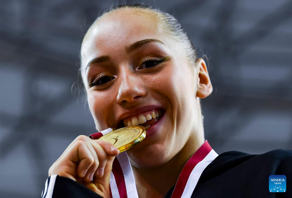 Gold medalist Kaylia Nemour of Algeria poses for photos after the awarding ceremony for the women's floor exercise final event at the 16th FIG Artistic Gymnastics Apparatus World Cup in Doha, Qatar, April 20, 2024. (Photo by Nikku/Xinhua)