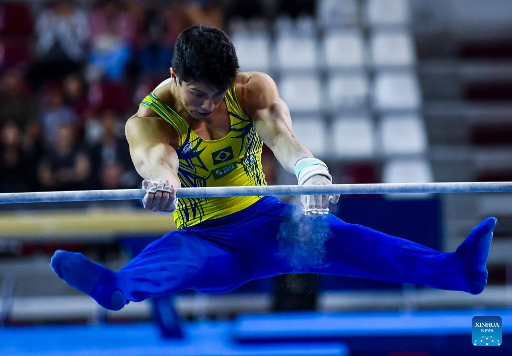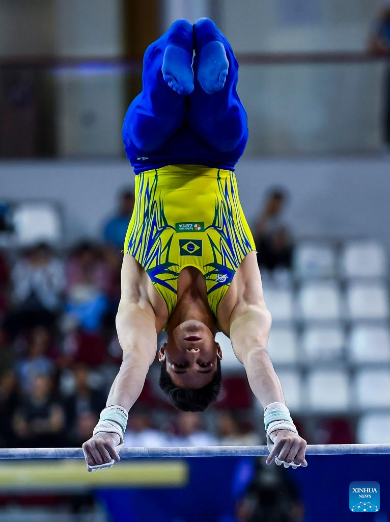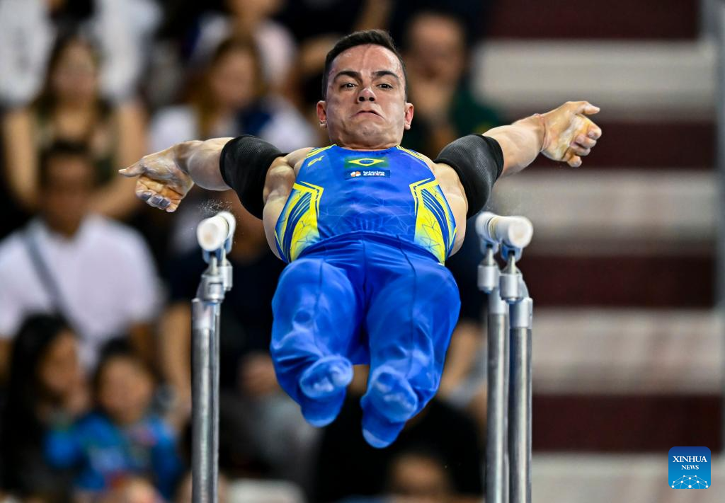 Caio Souza of Brazil competes during the men's parallel bars final at the 16th FIG Artistic Gymnastics Apparatus World Cup in Doha, Qatar, April 20, 2024. (Photo by Nikku/Xinhua)