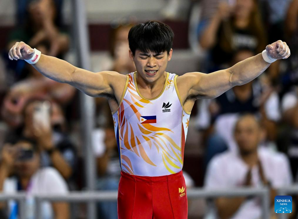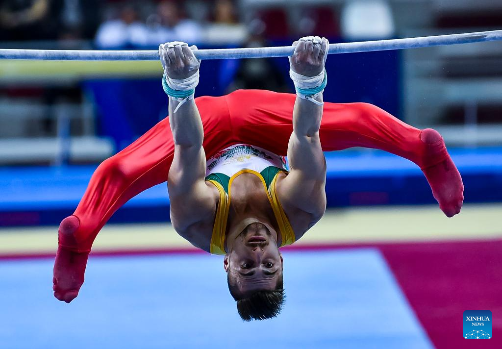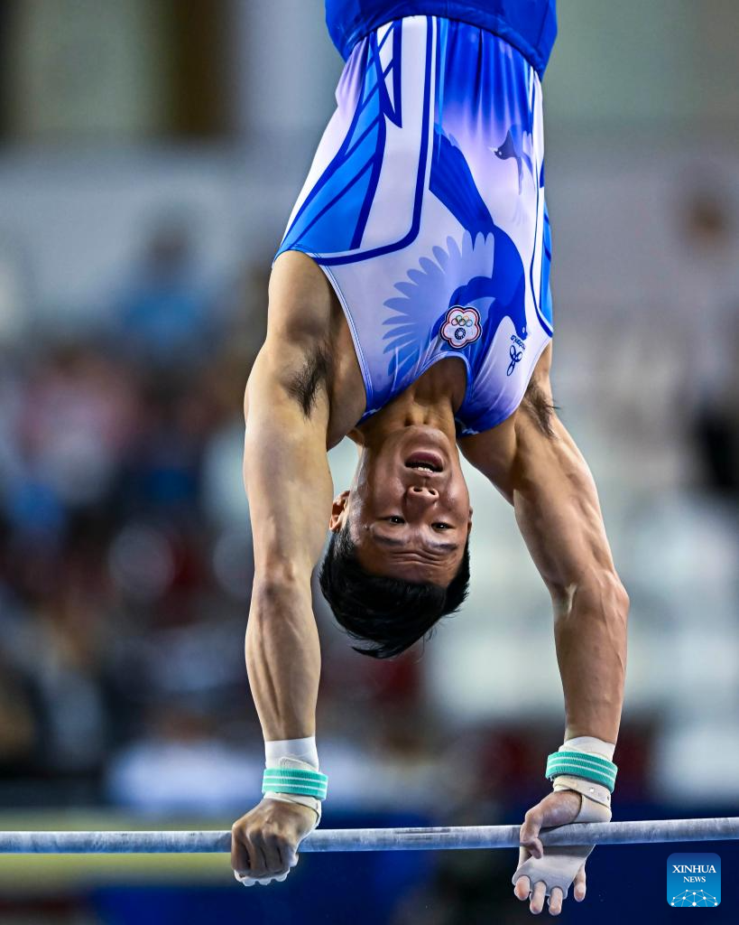 Carlos Edriel Yullo of the Philippines competes during the men's parallel bars final at the 16th FIG Artistic Gymnastics Apparatus World Cup in Doha, Qatar, April 20, 2024. (Photo by Nikku/Xinhua)