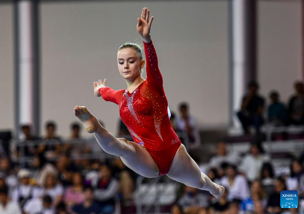 Ruby Evans of Great Britain competes during the women's floor exercise final at the 16th FIG Artistic Gymnastics Apparatus World Cup in Doha, Qatar, April 20, 2024. (Photo by Nikku/Xinhua)