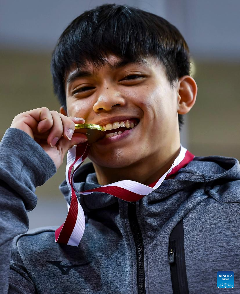 Gold medalist Carlos Edriel Yulo of the Philippines poses for photos after the awarding ceremony for the men's parallel bars final event at the 16th FIG Artistic Gymnastics Apparatus World Cup in Doha, Qatar, April 20, 2024. (Photo by Nikku/Xinhua)