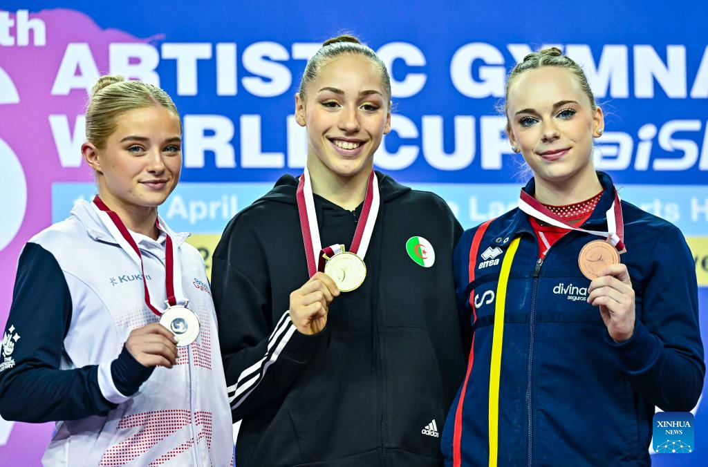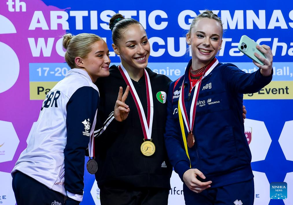 Gold medalist Kaylia Nemour (C) of Algeria, silver medalist Ruby Evans (L) of Britain and bronze medalist Laura Casabuena of Spain pose for group photos during the awarding ceremony for the women's floor exercise final event at the 16th FIG Artistic Gymnastics Apparatus World Cup in Doha, Qatar, April 20, 2024. (Photo by Nikku/Xinhua)