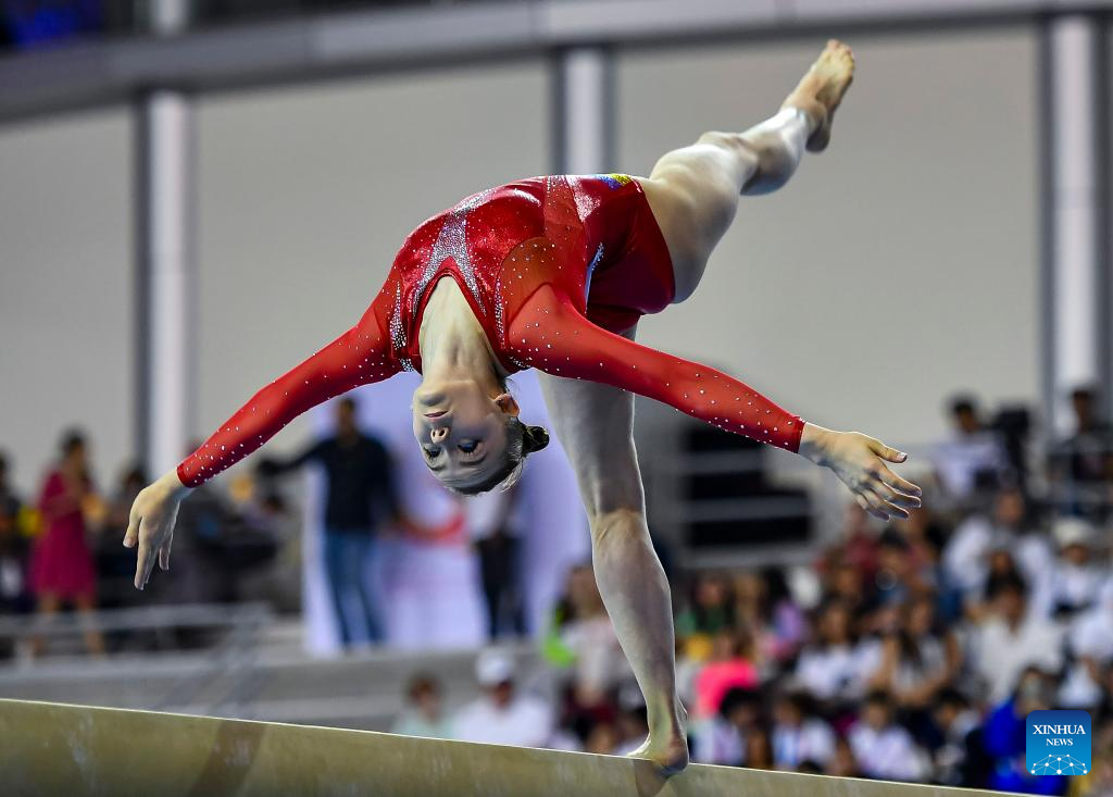 Anna Lashchevska of Ukraine competes during the women's balance beam final at the 16th FIG Artistic Gymnastics Apparatus World Cup in Doha, Qatar, April 20, 2024. (Photo by Nikku/Xinhua)
