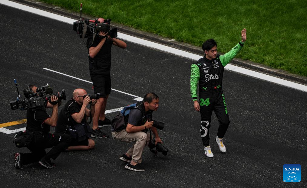 Kick Sauber's Chinese driver Zhou Guanyu (1st R) waves to the spectators after the Chinese Formula One Grand Prix race at the Shanghai International Circuit in Shanghai, China, on April 21, 2024. (Xinhua/Xia Yifang)