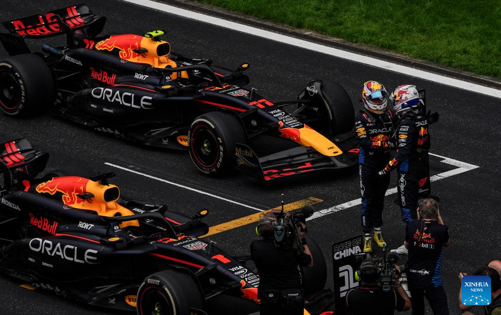 Red Bull Racing's Dutch driver Max Verstappen (R) and Mexican driver Sergio Perez shake hands after the Chinese Formula One Grand Prix race at the Shanghai International Circuit in Shanghai, China, on April 21, 2024. (Xinhua/Xia Yifang)